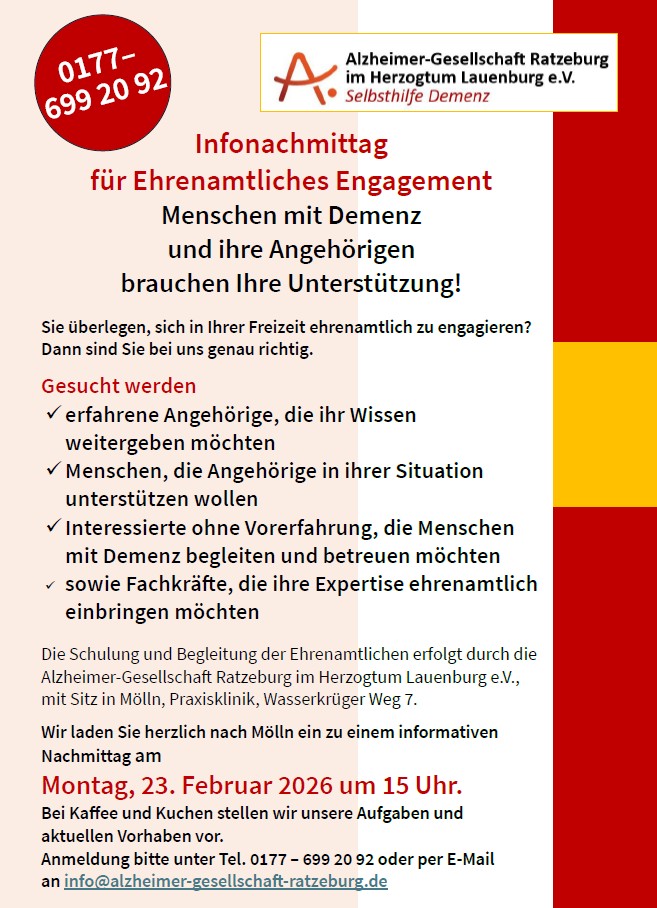 Die Alzheimer-Gesellschaft Ratzeburg im Herzogtum Lauenburg e.V. bietet Informationen, Beratung und konkrete Hilfestellungen für Betroffene, Angehörige sowie für alle, die sich um einen an Menschen mit Demenz kümmern (möchten).