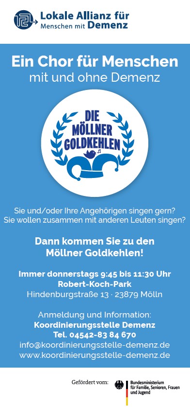 „Die Möllner Goldkehlen - ein Chor für Menschen mit und ohne Demenz“ ist ein Projekt der Gemeinschaft Pflegeberatung im Kreis Herzogtum Lauenburg e.V., durchgeführt von der Koordinierungsstelle Demenz. Es wird im Rahmen der „Lokalen Allianzen für Menschen mit Demenz“ vom Bundesministerium für Familie, Senioren, Frauen und Jugend gefördert.